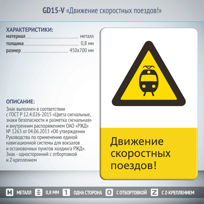 Знак «Движение скоростных поездов!», GD15-V (односторонний вертикальный, 450х700 мм, металл, с отбортовкой и Z-креплением) в Москве купить