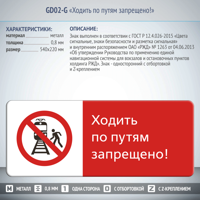 Знак «Ходить по путям запрещено!», GD02-G (односторонний горизонтальный, 540х220 мм, металл, с отбортовкой и Z-креплением) в Москве купить