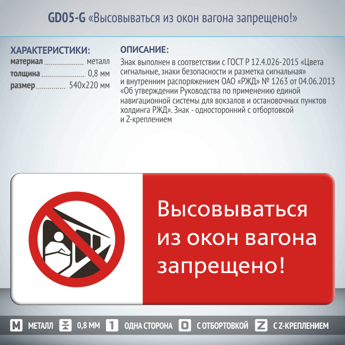 Знак «Высовываться из окон вагона запрещено!», GD05-G (односторонний горизонтальный, 540х220 мм, металл, с отбортовкой и Z-креплением) в Москве купить