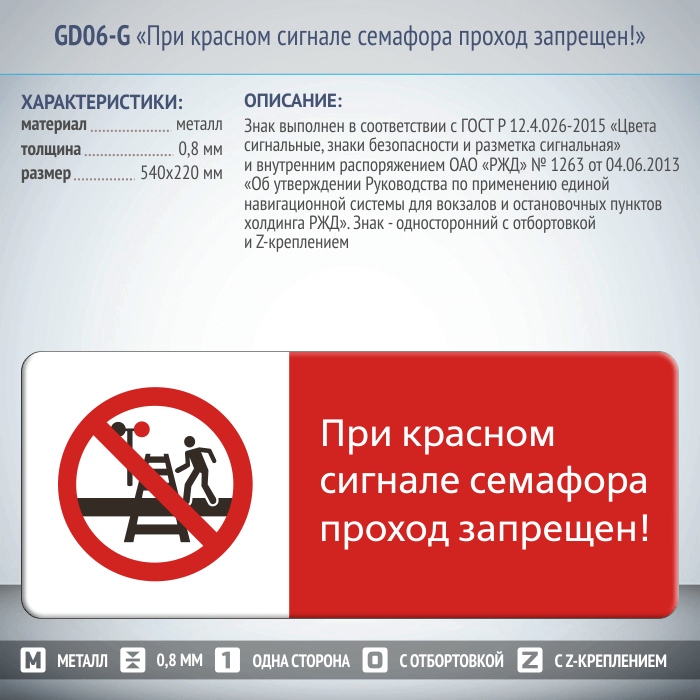 Знак «При красном сигнале семафора проход запрещен!», GD06-G (односторонний горизонтальный, 540х220 мм, металл, с отбортовкой и Z-креплением) в Москве купить