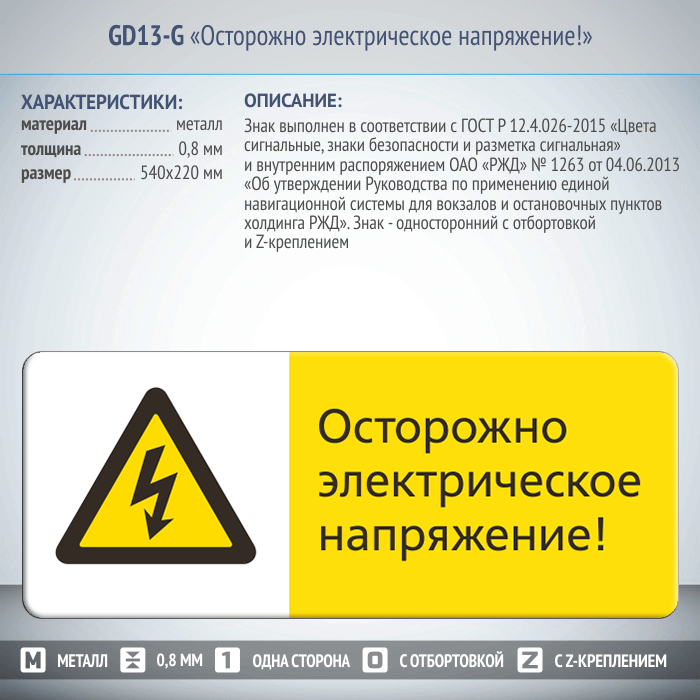Знак «Осторожно электрическое напряжение!», GD13-G (односторонний горизонтальный, 540х220 мм, металл, с отбортовкой и Z-креплением) в Москве купить
