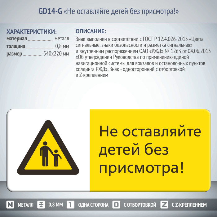 Знак «Не оставляйте детей без присмотра!», GD14-G (односторонний горизонтальный, 540х220 мм, металл, с отбортовкой и Z-креплением) в Москве купить