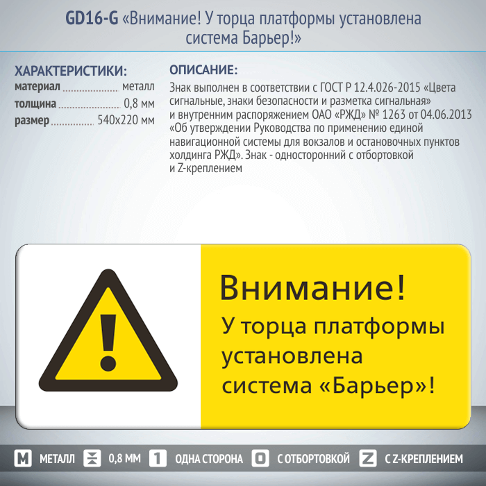 Знак «Внимание! У торца платформы установлена система Барьер!», GD16-G (односторонний горизонтальный, 540х220 мм, металл, с отбортовкой и Z-креплением) в Москве купить