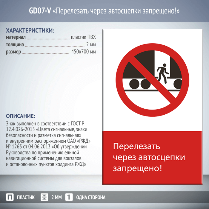 Знак «Перелезать через автосцепки запрещено!», GD07-V (односторонний вертикальный, 450х700 мм, пластик 2 мм) в Москве купить