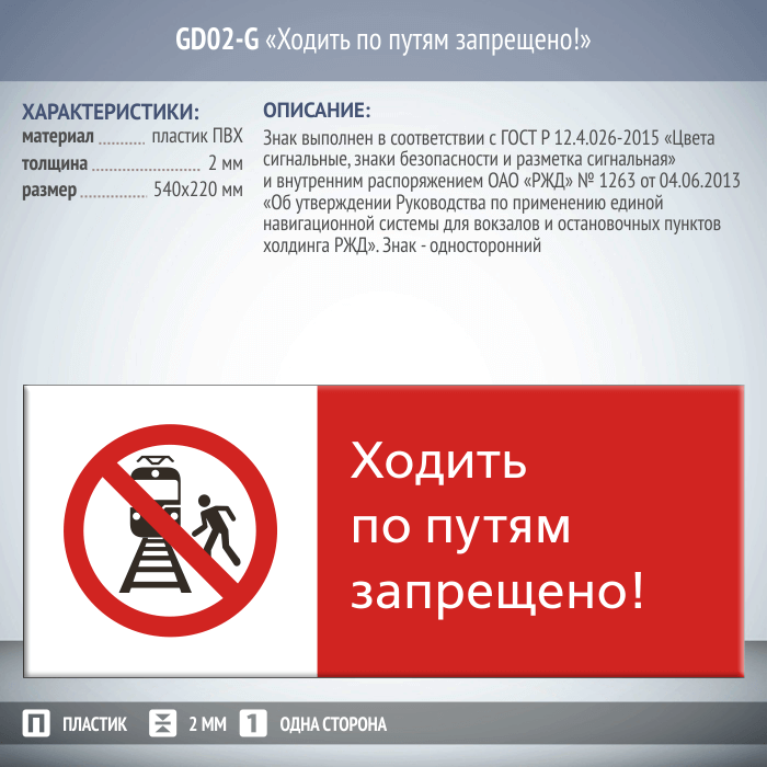 Знак «Ходить по путям запрещено!», GD02-G (односторонний горизонтальный, 540х220 мм, пластик 2 мм) в Москве купить