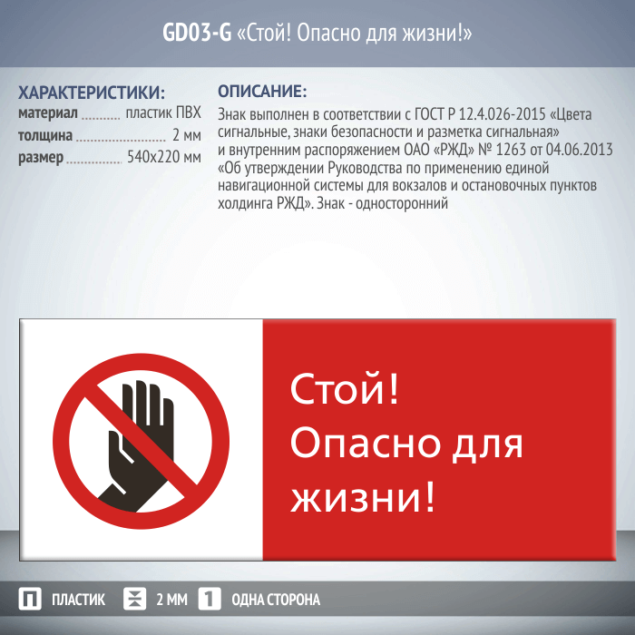 Знак «Стой! Опасно для жизни!», GD03-G (односторонний горизонтальный, 540х220 мм, пластик 2 мм) в Москве купить