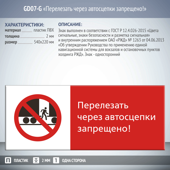 Знак «Перелезать через автосцепки запрещено!», GD07-G (односторонний горизонтальный, 540х220 мм, пластик 2 мм) в Москве купить
