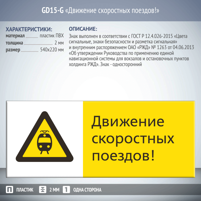 Знак «Движение скоростных поездов!», GD15-G (односторонний горизонтальный, 540х220 мм, пластик 2 мм) в Москве купить