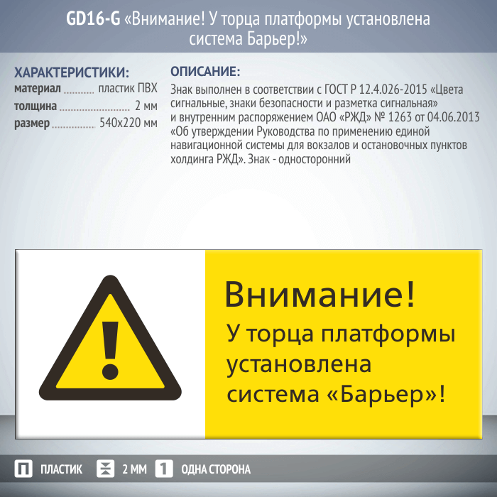 Знак «Внимание! У торца платформы установлена система Барьер!», GD16-G (односторонний горизонтальный, 540х220 мм, пластик 2 мм) в Москве купить