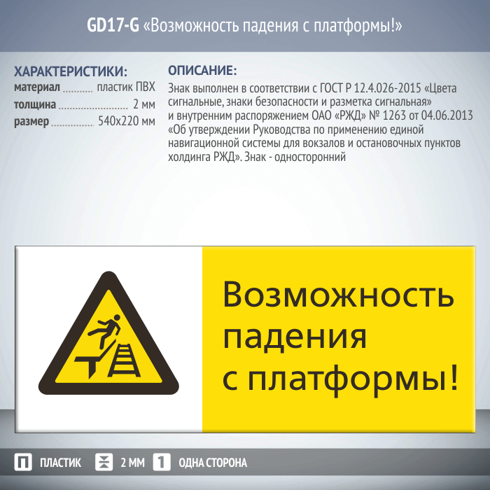 Знак «Возможность падения с платформы!», GD17-G (односторонний горизонтальный, 540х220 мм, пластик 2 мм) в Москве купить