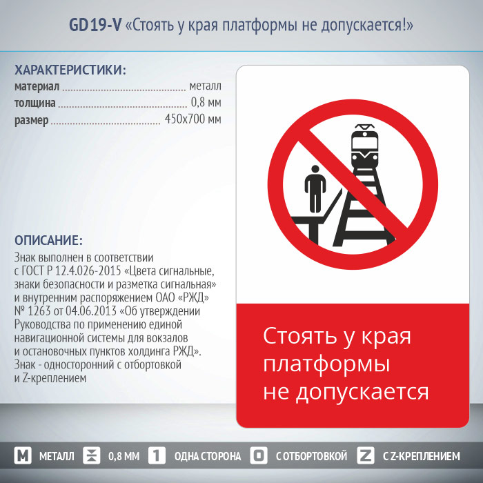 Знак «Стоять у края платформы не допускается!», GD19-V (односторонний вертикальный, 450х700 мм, металл, с отбортовкой и Z-креплением) в Москве купить