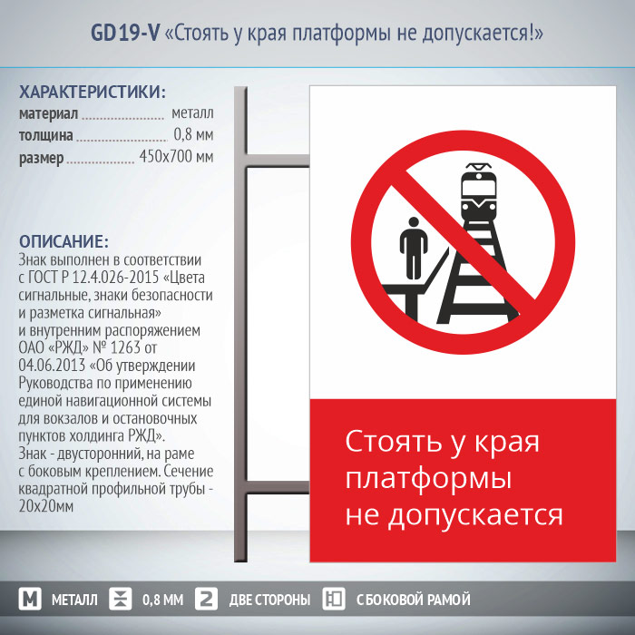 Знак «Стоять у края платформы не допускается!», GD19-V (двусторонний вертикальный, 450х700 мм, металл, на раме с боковым креплением) в Москве купить