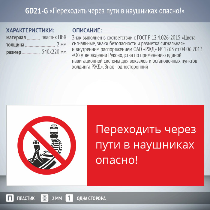 Знак «Переходить через пути в наушниках опасно!», GD21-G (односторонний горизонтальный, 540х220 мм, пластик 2 мм) в Москве купить