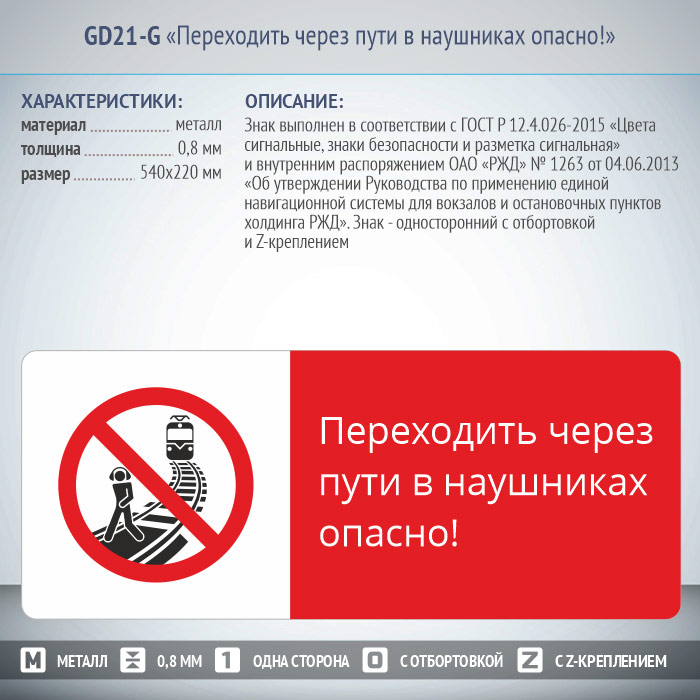 Знак «Переходить через пути в наушниках опасно!», GD21-G (односторонний горизонтальный, 540х220 мм, металл, с отбортовкой и Z-креплением) в Москве купить