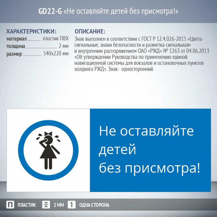 Знак «Не оставляйте детей без присмотра!», GD22-G (односторонний горизонтальный, 540х220 мм, пластик 2 мм) в Москве купить