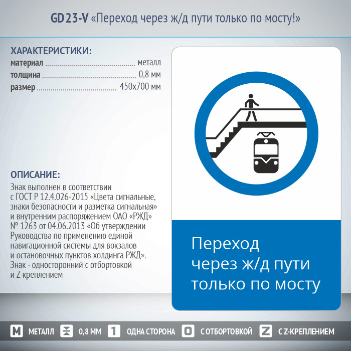 Знак «Переход через ж/д пути только по мосту!», GD23-V (односторонний вертикальный, 450х700 мм, металл, с отбортовкой и Z-креплением) в Москве купить