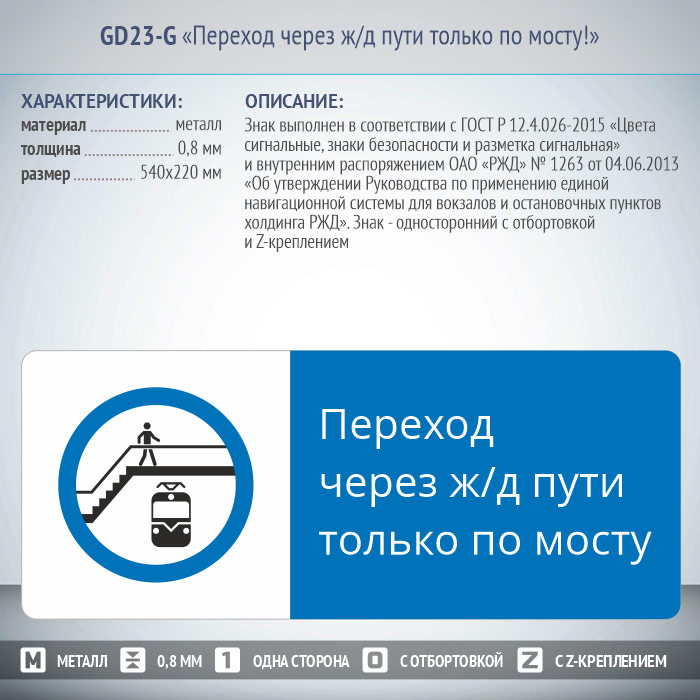 Знак «Переход через ж/д пути только по мосту!», GD23-G (односторонний горизонтальный, 540х220 мм, металл, с отбортовкой и Z-креплением) в Москве купить