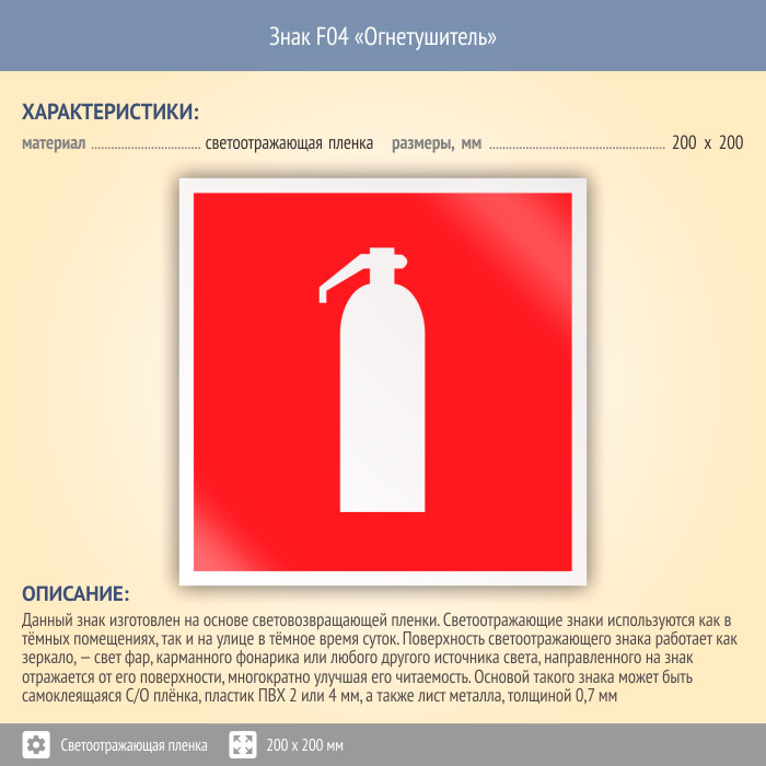 Знак F04 «Огнетушитель» (светоотражающая пленка, 200х200 мм) в Москве купить