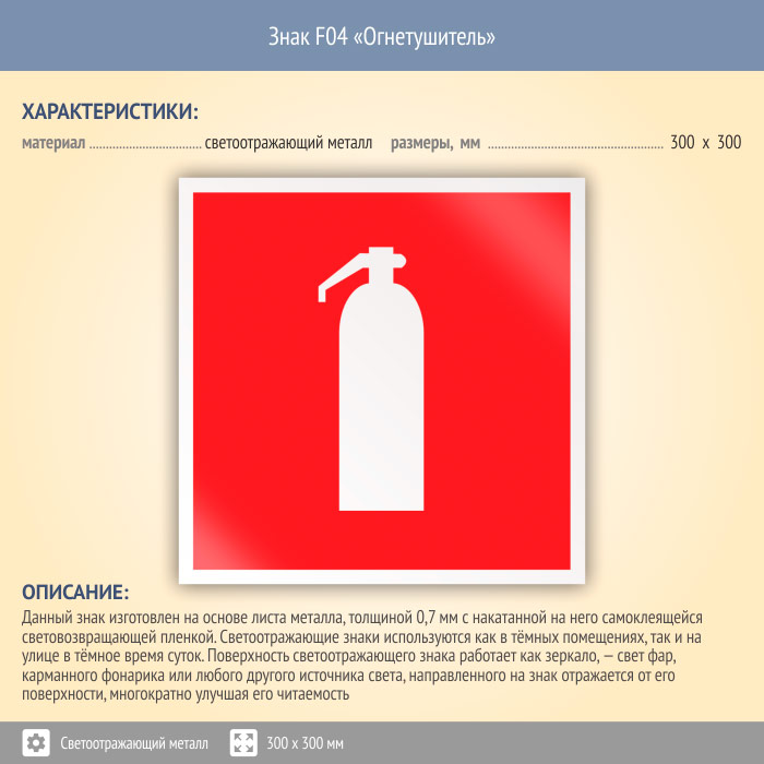 Знак F04 «Огнетушитель» (светоотражающий металл, 300х300 мм) в Москве купить