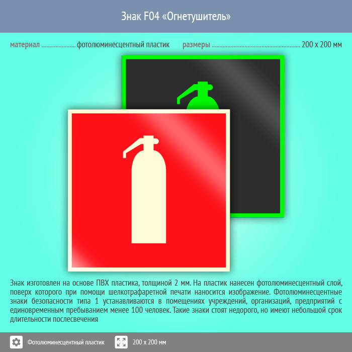 Знак F04 «Огнетушитель» (фотолюминесцентный пластик, 200х200 мм) в Москве купить