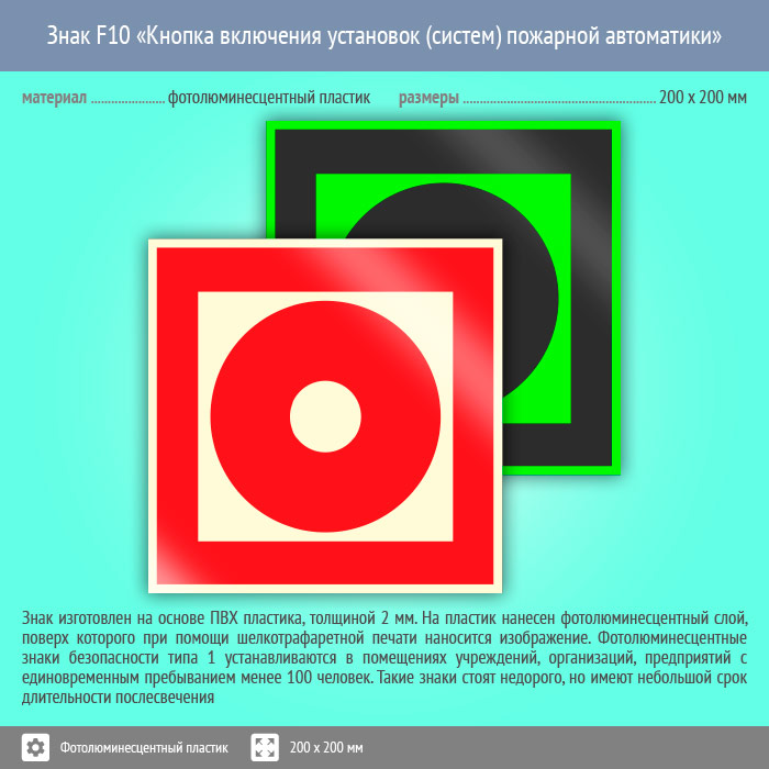 Знак F10 «Кнопка включения установок (систем) пожарной автоматики» (фотолюминесцентный пластик, 200х200 мм) в Москве купить