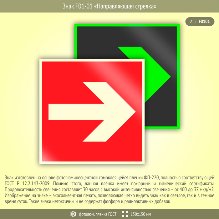 Знак F01-01 «Направляющая стрелка» (фотолюминесцентная пленка ГОСТ 34428-2018, 150х150 мм) в Москве купить