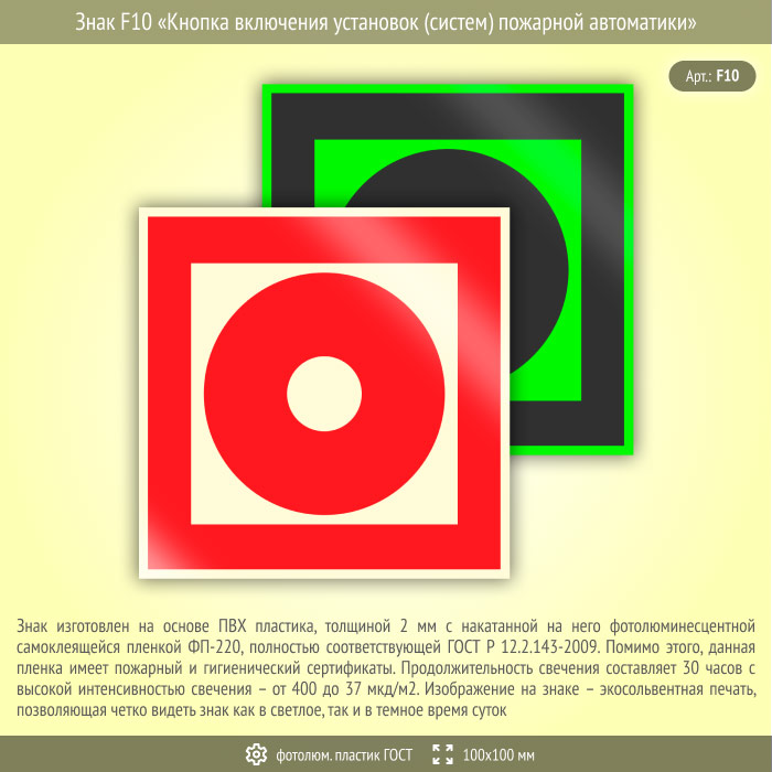 Знак F10 «Кнопка включения установок (систем) пожарной автоматики» (фотолюминесцентный пластик ГОСТ 34428-2018, 100х100 мм) в Москве купить