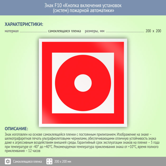 Знак F10 «Кнопка включения установок (систем) пожарной автоматики» (пленка, 200х200 мм) в Москве купить