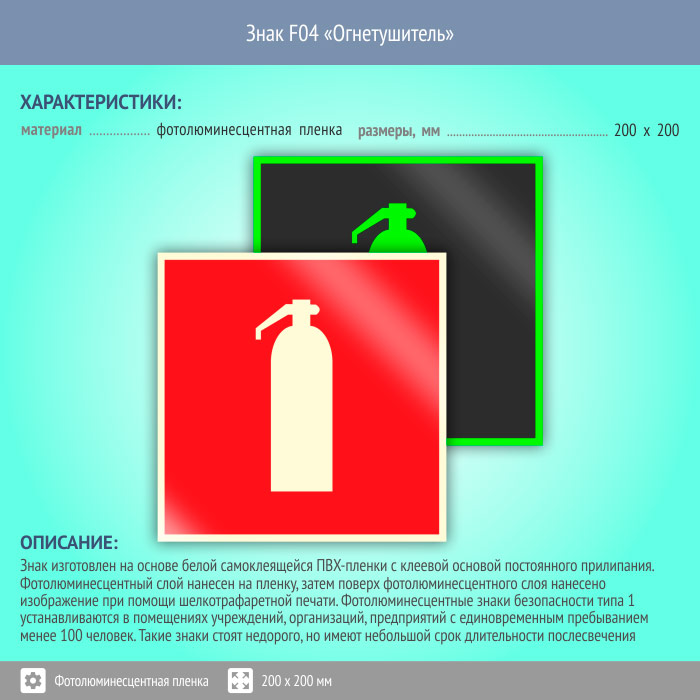 Знак F04 «Огнетушитель» (фотолюминесцентная пленка, 200х200 мм) в Москве купить