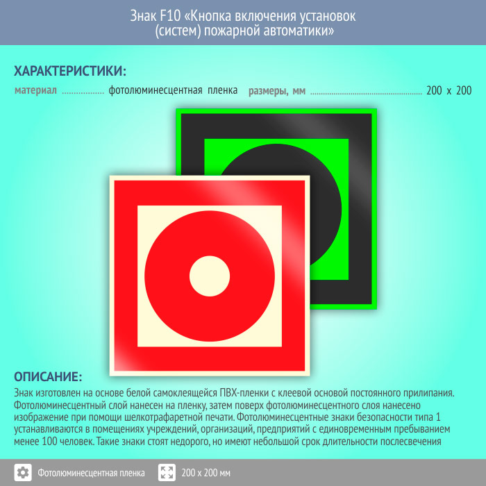Знак F10 «Кнопка включения установок (систем) пожарной автоматики» (фотолюминесцентная пленка, 200х200 мм) в Москве купить