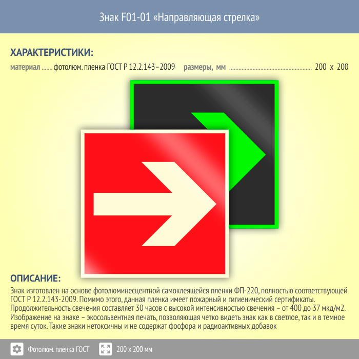 Знак F01-01 «Направляющая стрелка» (фотолюминесцентная пленка ГОСТ 34428-2018, 200х200 мм) в Москве купить