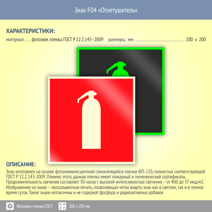 Знак F04 «Огнетушитель» (фотолюминесцентная пленка ГОСТ 34428-2018, 200х200 мм) в Москве купить