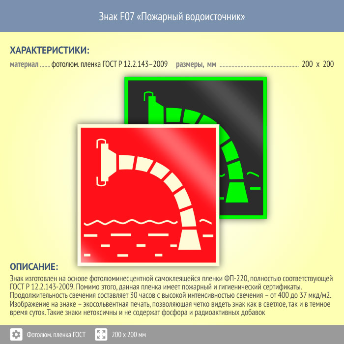 Знак F07 «Пожарный водоисточник» (фотолюминесцентная пленка ГОСТ 34428-2018, 200х200 мм) в Москве купить