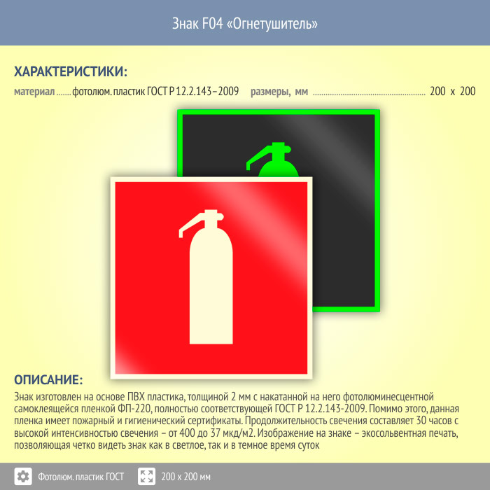 Знак F04 «Огнетушитель» (фотолюминесцентный пластик ГОСТ 34428-2018, 200х200 мм) в Москве купить