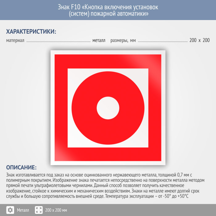 Знак F10 «Кнопка включения установок (систем) пожарной автоматики» (металл, 200х200 мм) в Москве купить